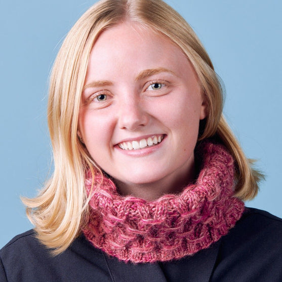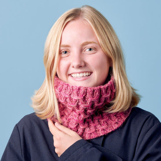 Le cache-col a un joli motif en smocks, qui est passionnant à tricoter.