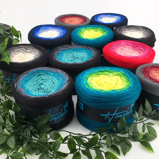 Honolulu est un magnifique fil doux avec quatre brins fins, qui se suivent sans être filés ensemble. La transition entre les couleurs se fait progressivement et lentement, ce qui résulte en de très beaux dégradés de couleurs dans votre ouvrage.
