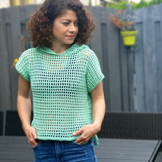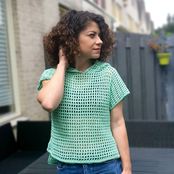 Le Fresh Hoodie T-shirt est 100% à la hauteur de son nom! Il est frais à la fois grâce à sa couleur et son design, et est parfait pour les journées chaudes d’été. Le T-shirt est crocheté en Rainbow Cotton 8/6, qui existe dans de magnifiques couleurs!