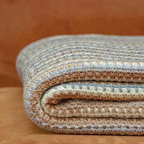 La couverture est crochetée en Horizon, un fil acrylique premium ravissant, aux belles combinaisons de couleurs. Les couleurs sont vraiment mises en valeur et créent de belles rayures.