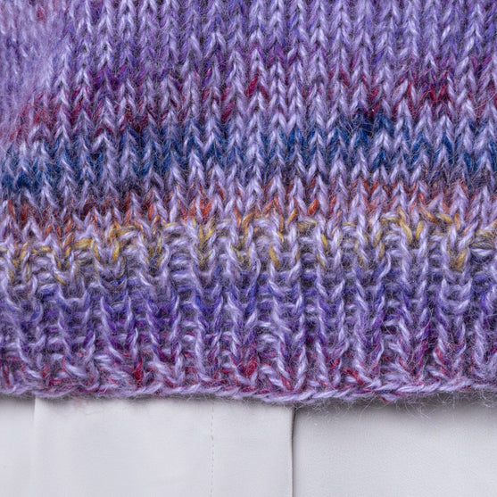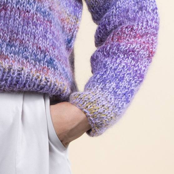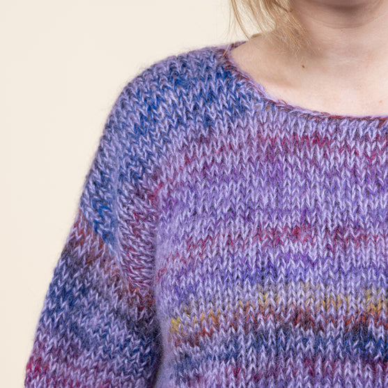 Il est tricoté en deux fils de fil mélangé et la combinaison de mohair, de laine et d'acrylique le rend bien moelleux sans être trop lourd. Le beau jeu de couleurs dans le fil Manyana donne beaucoup de vie au pull, qui peut être conçu dans une multitude de couleurs.