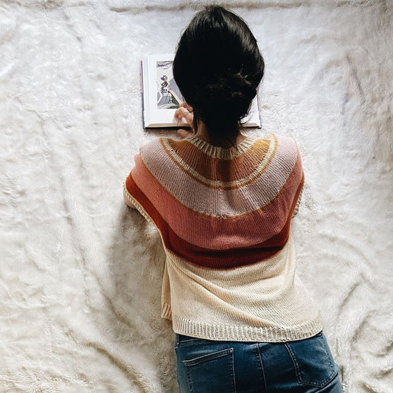 Le pull est construit de haut en bas, avec un empiècement rayé et les instructions et le fil requis pour deux types manches (courtes/ longues) et deux longueurs (court/long).