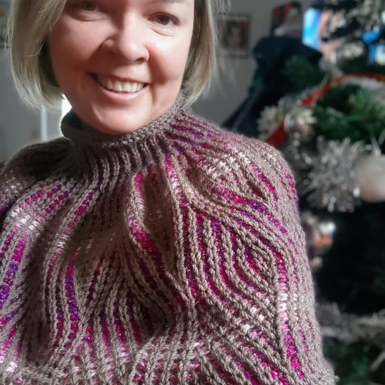 La pélerine est travaillée en rond, en crochet tunisien “feuillu”, en rond en spirale, en utilisant les points et les techniques de base (pts, env, point côte, diminution, augmentation). Elle se tricote de haut en bas, en partant d’un col côtelé légèrement col roulé, puis en augmentant progressivement, pour finir avec le motif sinueux. Le motif “feuillu” se tricote en multiples de 18 avec une répétition de 22 rangs.