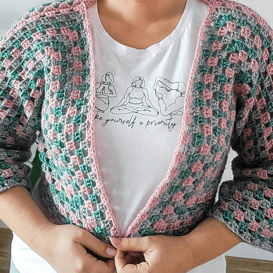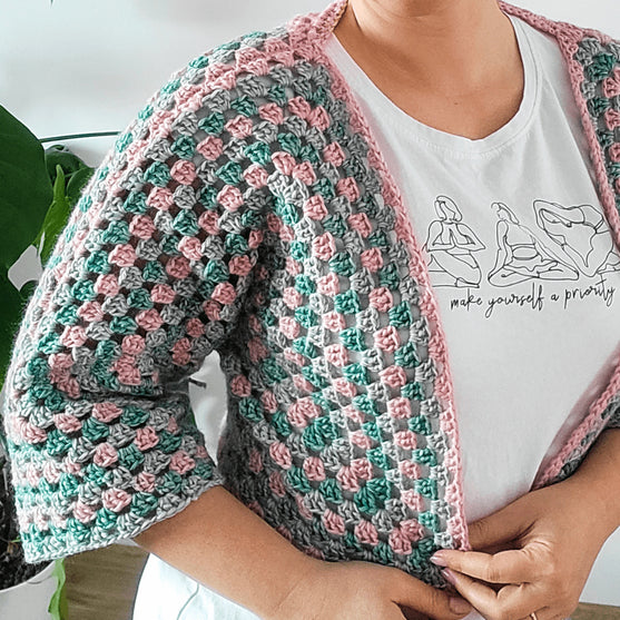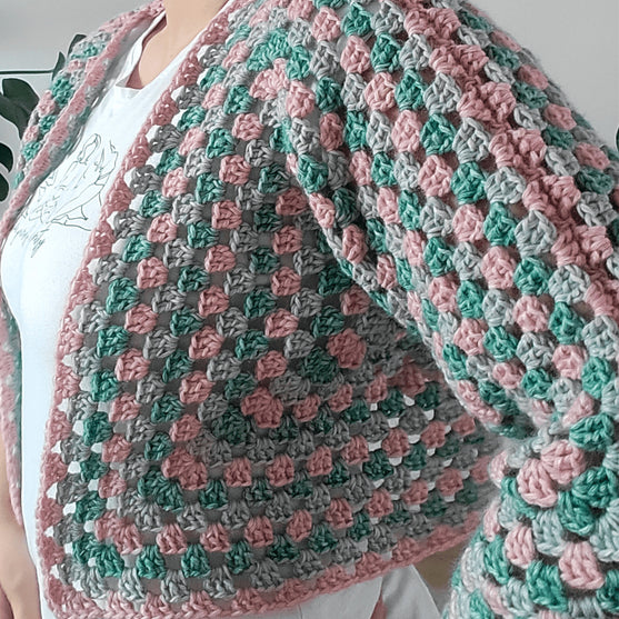 Ce joli gilet boléro est simple à faire et sera parfait pour les tenues de printemps. Il vous garde au chaud et douillet pendant les premiers jours du printemps! Il est composé de deux hexagones avec un pièce arrière supplémentaire et quelques rang de plus pour les manches. Si vous préférez, vous pouvez également le rendre plus long en ajoutant plus de rangs en bas comme vous le ferez avec les manches. Si vous voulez que vos manches soient plus lâches, il suffit de faire plus de rangs d’hexagone, mais ajustez la taille de votre pièce arrière et n’oubliez pas d’acheter plus de fil!!
