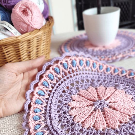 Voici un modèle au crochet pour un set de table texturé rond avec plein d’éléments 3D. Le niveau requis est débutant confirmé ou intermédiaire. Le projet est travaillé en un cercle et le diamètre de l’article terminé est d’environ 25 cm.