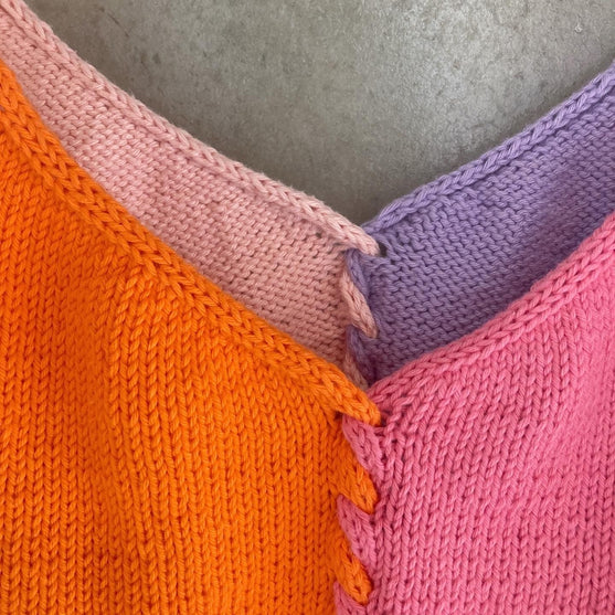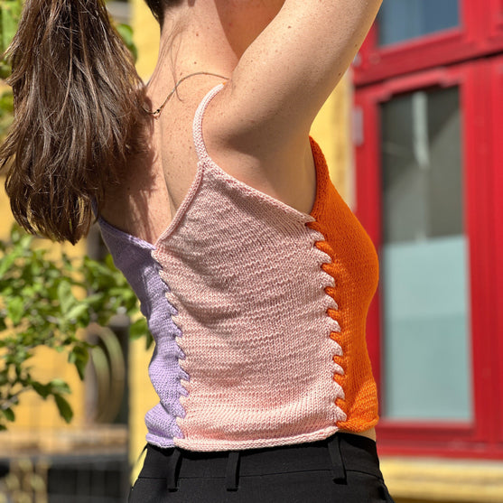 INFORMATIONS SUR LE MODÈLE Le débardeur est constitué de 4 parties avec chacune sa couleur, tricotée une par une et en commençant par la partie 1, 2, 3 puis 4. Il est tricoté du haut vers le bas et au point jersey en commençant par une bretelle en i-cord. Chaque bretelle est réalisée avec un montage double de mailles et enfin cousue à l’aide d’une couture invisible. Il est ainsi possible d’ajuster la longueur des bretelles à la fin. Toutes les parties seront assemblées à l’aide de torsades. Le débardeur est ensuite tricoté en aller-retour et l’on tourne l’ouvrage avec des torsades pour tourner. L’ouvrage est fini avec une bordure en i-cord. Remarque : ce modèle est acheté en format PDF téléchargeable. Il n'est donc pas expédié en format imprimé.