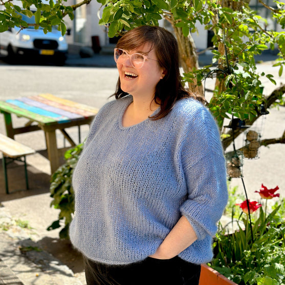 Le pull est tricoté de bas en haut avec 4 fils de Friends Kid Silk. Les mailles pour les emmanchures et l’encolure en V sont rabattues. Les épaules sont inclinées et cousues ensemble à la fin. Les mailles sont relevées à l’emmanchure, et les manches sont tricotées de haut en bas. Une I-cord est travaillée pour chaque bordure.