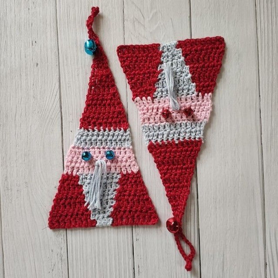 Cette décoration triangulaire est très simple à réaliser. La seule partie compliquée est le corps du Père Noël, qui est composé de trois petits éléments en trapèzes et assemblés en utilisant la méthode d’assemblage au fur et à mesure (or AAFM). Cette technique, quand elle est utilisée, est indiquée par des mailles coulées écrites en gras (mc) dans le modèle.