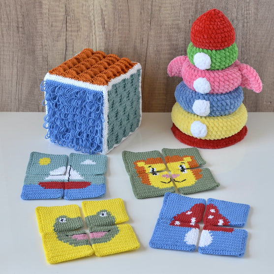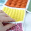 - Chaque face du cube est travaillée avec une technique de crochet spéciale : point boucle, point bobble, point gaufre, point panier, bride dans la boucle avant et arrière.