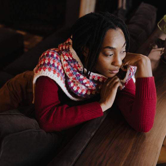 Le modèle du l'Écharpe à Capuche OMG fait partie de la collection de modèles Happy Place, conçue pour correspondre au fil Happy Place Apricity. Trouvez encore plus de modèles et le fil nécessaire pour ce projet sur le site de Hobbii.