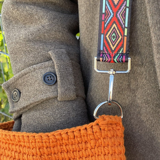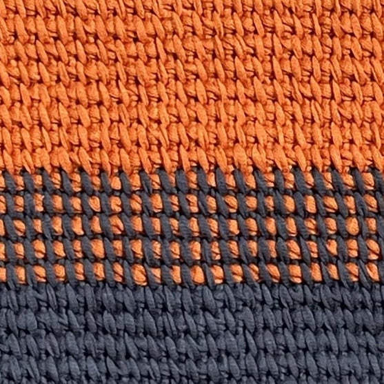 Le sac est crocheté en rond à l’aide d’un crochet tunisien à deux têtes. Cette bandoulière est crochetée au point tunisien endroit et comporte un fond gris, une partie en rayures au milieu. Le reste est orange. La finition de la bordure se fait avec des demi-brides dans les grilles. Le fond est assemblé au sac avec des demi-brides. La sangle est fixée de chaque côté du sac. Voir les explications du crochet tunisien en rond à la fin du modèle.